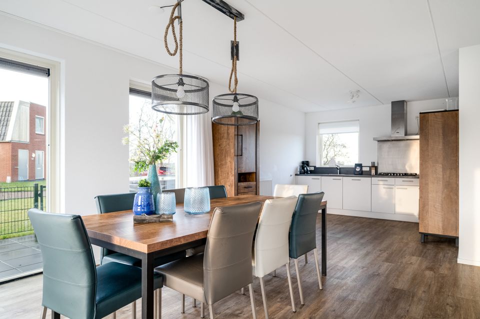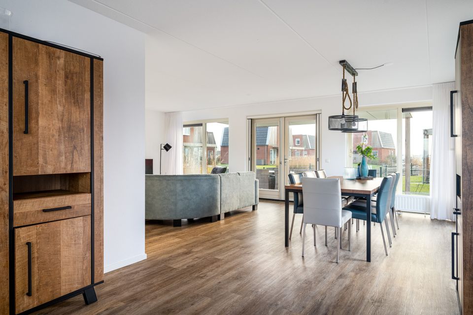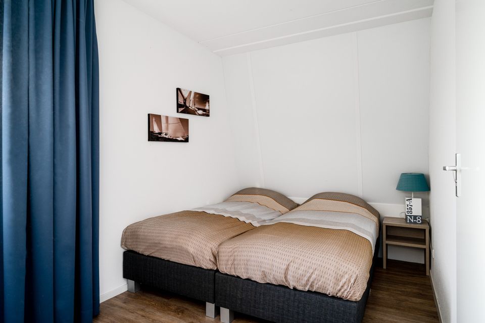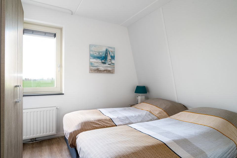 Op de begane grond bevindt zich de hal met separaat toilet. De woonkamer bevat een zit- en eethoek met flatscreen TV. De open keuken beschikt o.a. over een vaatwasser, combi-magnetron en koffiezetapparaat. De waterzijde van de woning heeft openslaande deuren naar het terras met tuinmeubilair en een buitenspa. De woning bevat tevens een berging waar je netjes al je spullen kunt opbergen. De bovenverdieping heeft vier slaapkamers en alle vier zijn uitgevoerd met twee ƩƩn persoons boxspringbedden. De bovenverdieping bevat twee badkamers met douche (cabine), wastafel en separaat toilet.