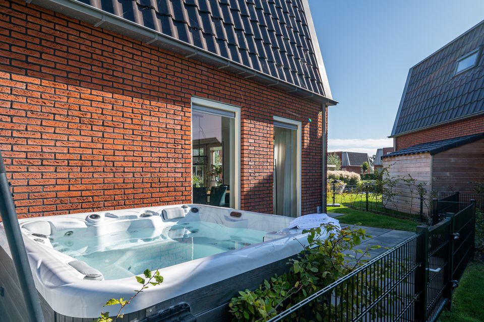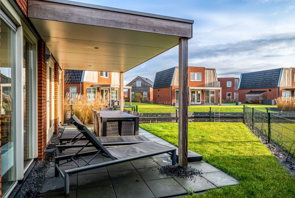 Luxe 8 persoons vakantiewoning aan het water met vier slaapkamers op de bovenverdieping en buitenspa.
