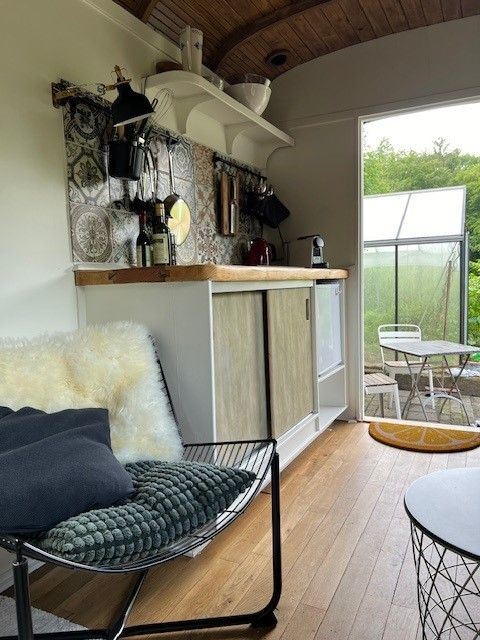 De kampeerkeet is geschikt voor een langer verblijf en beschikt over een ingerichte keuken en koelkast, zodat je je eigen maaltijden kunt bereiden met ingrediënten van het seizoen.