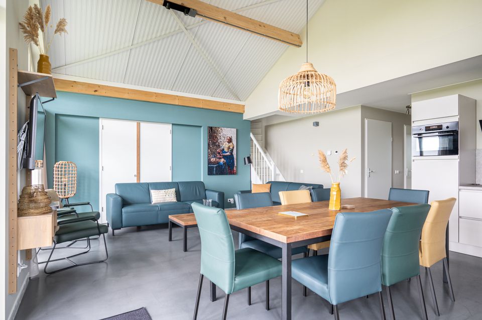 Op de begane grond bevindt zich de hal met een separaat toilet. De twee geschakelde woonkamers beschikken over ieder een zit- en eethoek met flatscreen televisie. De twee open keukens bieden onder andere een combimagnetron, inductiekookplaat, koffiezetapparaat en extra stille vaatwasser. Er zijn vijf slaapkamers en twee badkamers met douche op de begane grond. Op de bovenverdieping zijn nog twee slaapkamers. Alle slaapkamers hebben twee ƩƩnpersoons boxspringbedden. Er is een luxe badkamer met regendouche, sunshower, wastafel en toilet.