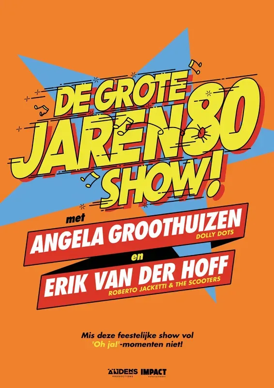 ‘De Grote Jaren 80 Show’ is een interactieve theatershow waarin Erik van der Hoff en Angela Groothuizen je meenemen langs muziek, beelden en verhalen uit de iconische eighties. Met muziekvideo’s, nieuwsfragmenten en een verrassende quiz vol nostalgische momenten wordt het een feestelijke avond vol herkenning.