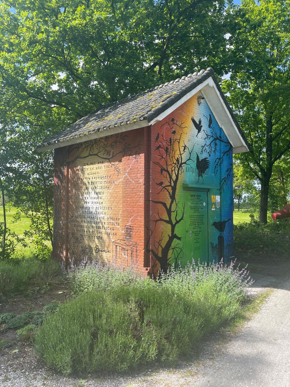 Tegenover de theetuin staat een kleurrijk transformatorhuis dat in 2021 werd omgetoverd kleurrijk kunstwerk met graffiti in regenboogkleuren en drie gedichten, waarvan één in het Fries.