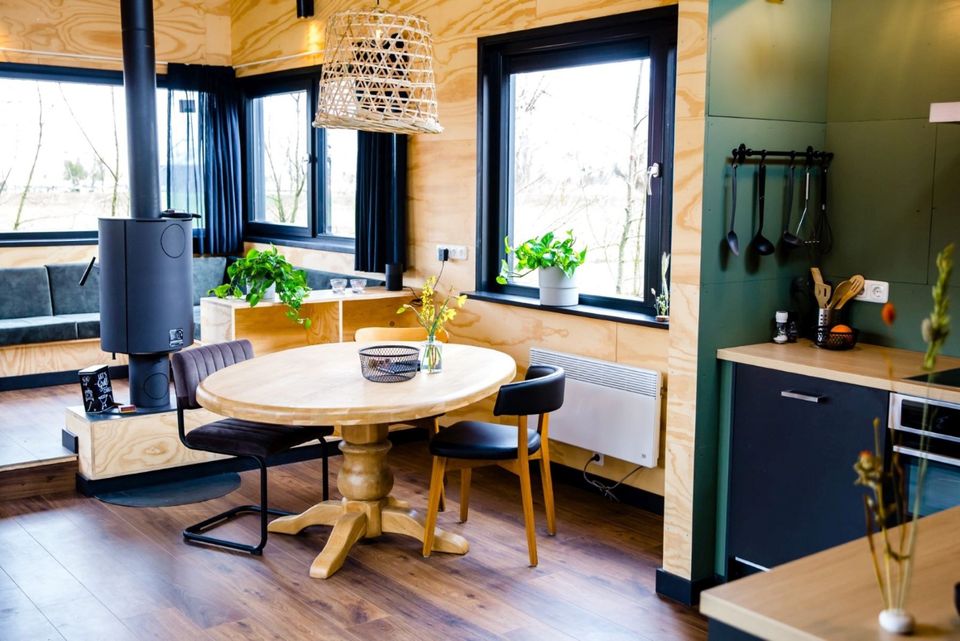 In dit gezellige huisje is de zithoek verhoogd, zo kun je over de mooie landerijen kijken. Via de ronde eettafel kom je bij de keuken. De keuken is voorzien van een magnetron, oven, koelkast en een diepvries. Er zijn twee slaapkamers, beide met twee losse bedden die je eventueel aan elkaar kunt schuiven. De bedden zijn voorzien van eenpersoonsdekbedden, kussens en een beschermhoes. In de badkamer is een douche en een dubbele wastafel. Er is een aparte toilet aanwezig in het huisje. Buiten op de veranda staat een tafel geschikt voor vier personen en een bankje.