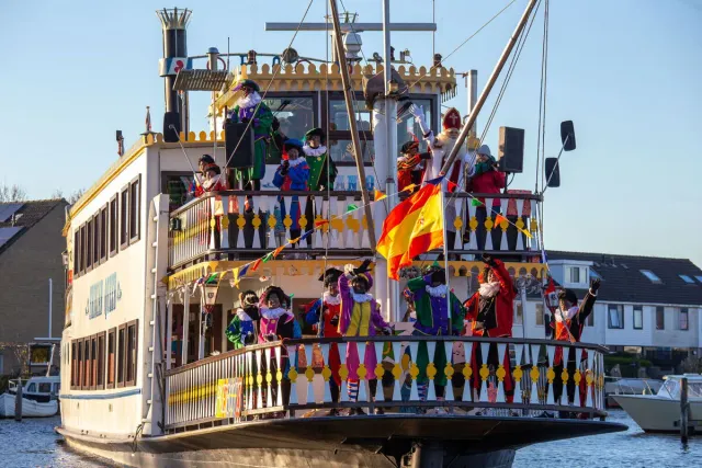 Intocht van Sinterklaas vanaf It Stalt door het dorp onder aanvoering van Muziekvereniging Harmonie.