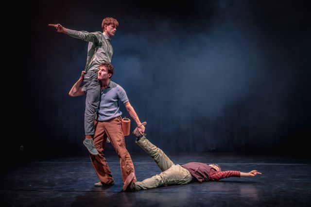 In het humoristische en absurdistische ‘Hou Vast’ verbeelden twee acrobaten en een muzikant met hun lichamen en (lijf)muziek de balans tussen vasthouden en loslaten. Drie reizigers zijn onderweg tussen toen en later.