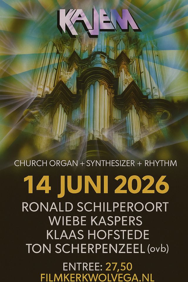 Op zondag 14 juni 2026 verandert de Filmkerk Wolvega in een podium waar klassiek, kerk en pop elkaar op unieke wijze ontmoeten. Het KAJEM 3.0-project brengt vier bevlogen musici samen die de grenzen van het orgel en de synthesizer verleggen: Ronald Schilperoort, Wiebe Kaspers, Klaas Hofstede en ā onder voorbehoud ā Ton Scherpenzeel.