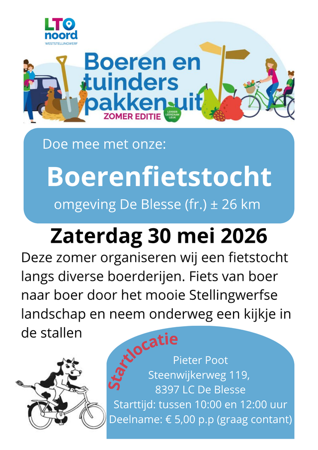Deze zomer organiseert LTO Weststellingwerf een fietstocht langs diverse boerderijen.