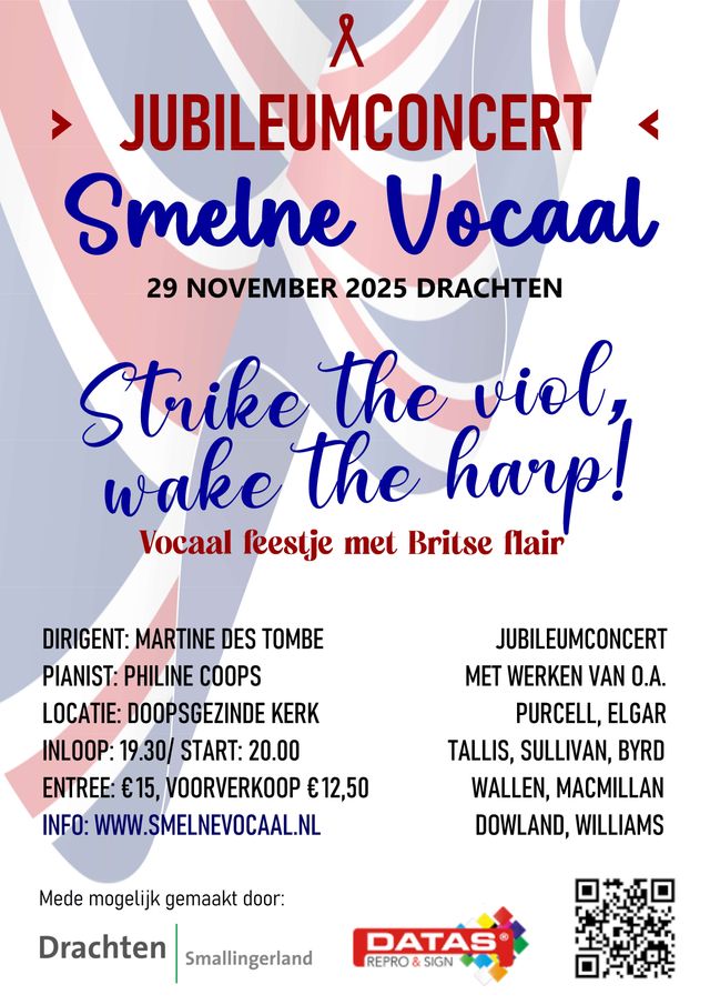 Daarin klinken onder meer delen uit Come, ye Sons of Art van Purcell, The Bavarian Highlands van Elgar en meer - als geheel zorgvuldig gekozen om de veelzijdigheid van het koor te laten horen. Smelne Vocaal staat onder de kundige leiding van dirigente Martine des Tombe en pianiste Philine Coops verzorgt ditmaal de pianobegeleiding.