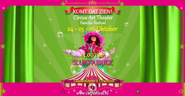 CAT staat voor Circus – Art – Theater: eigenzinnig, grappig, theatraal en kunstzinnig. Verwondering en beleving staan centraal. Geniet 2,5 uur van kijk-, doe- en beleefactiviteiten én een bijzondere voorstelling.