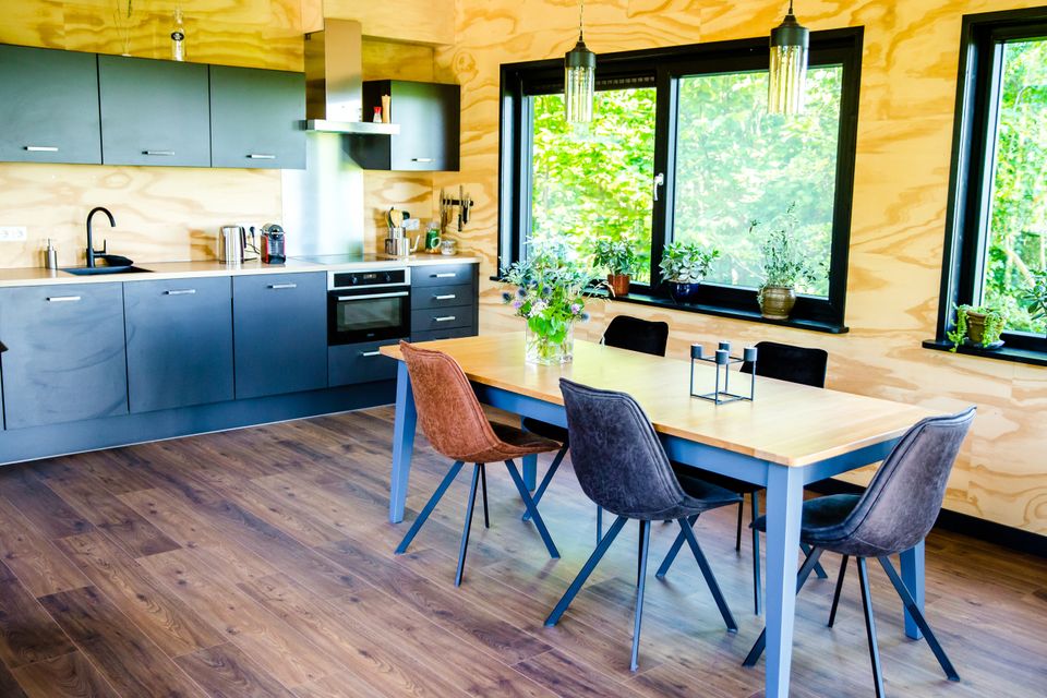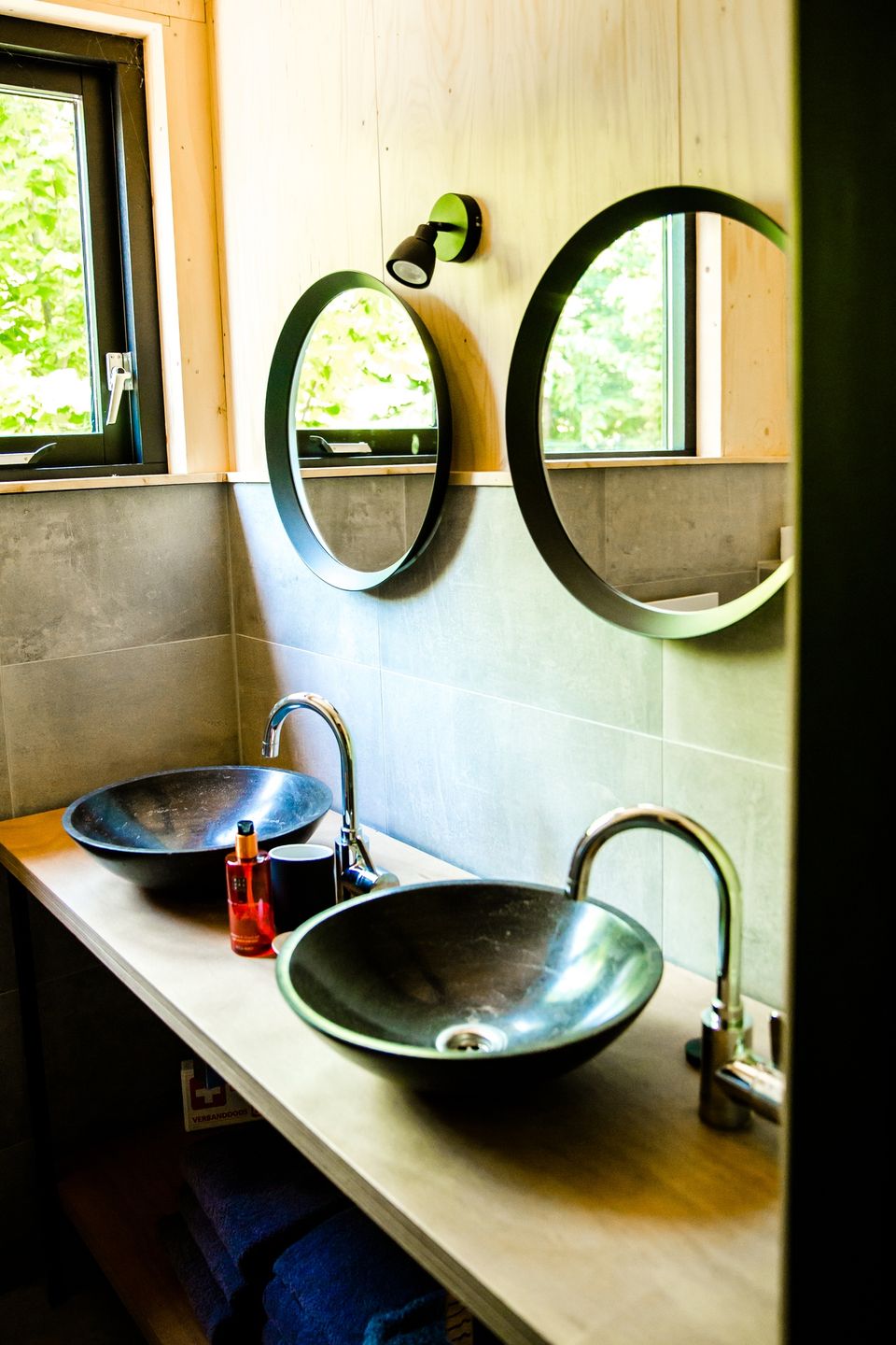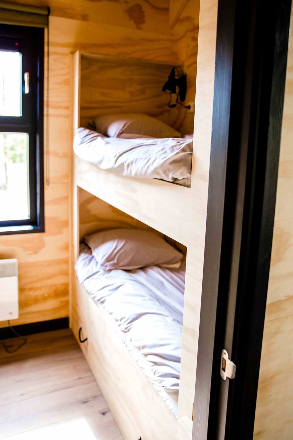 De eerste lodge vormt het centrale punt met een zithoek, lange eettafel en een keuken voor 16 personen. Hier vind je ook een tweepersoons slaapkamer met eigen badkamer en een extra toilet. Lodge 2 en 3 bieden elk slaapruimte voor acht personen met boxspringbedden en stapelbedden, een eigen keuken, zithoek en badkamer.