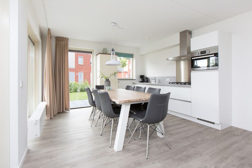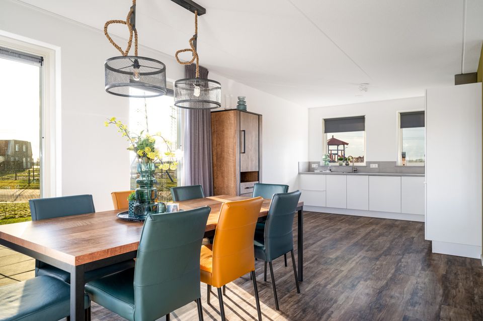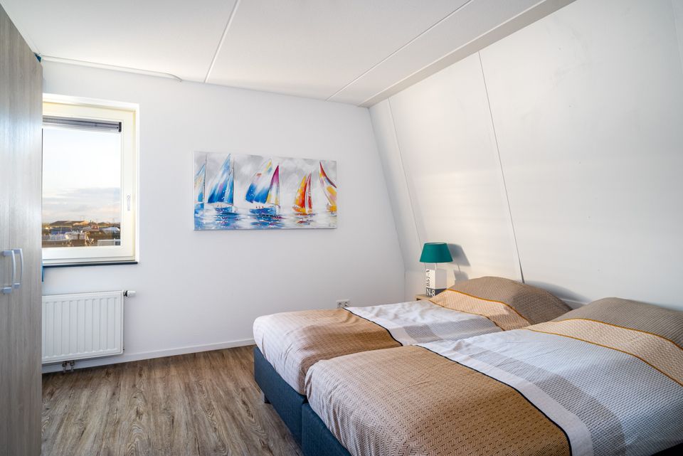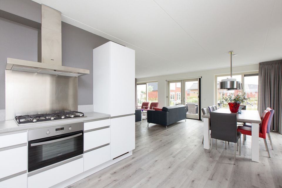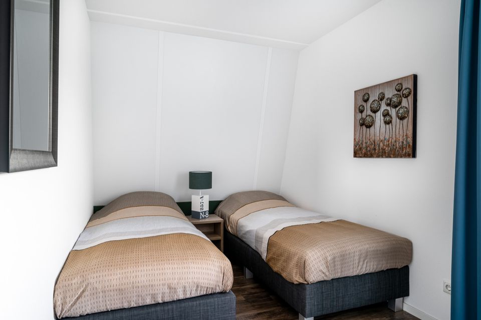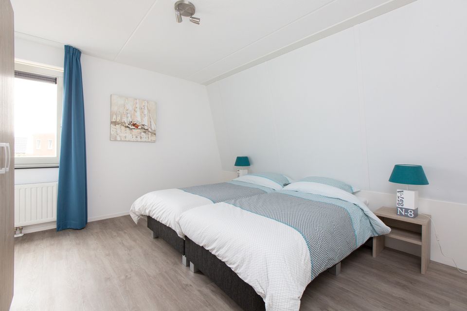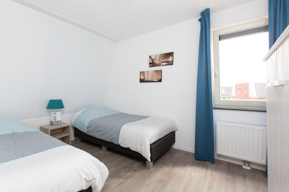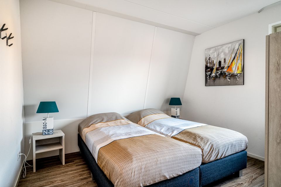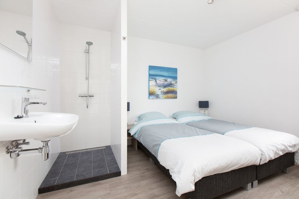 Op de begane grond bevindt zich de hal met separaat toilet. De woonkamer bevat een zit- en eethoek met flatscreen TV. De open keuken beschikt o.a. over een vaatwasser, combi-magnetron en koffiezetapparaat. De waterzijde van de woning heeft openslaande deuren naar het terras met tuinmeubilair. Er zijn ook 8-persoonswoningen met een slaapkamer op de begane grond met een inloop badkamer en drie slaapkamers op de verdieping en ƩƩn badkamer met douche (cabine), wastafel en toilet. De bovenverdieping heeft drie c.q. vier slaapkamers (afhankelijk van het huisnummer waarvoor je kiest) en alle drie c.q. vier zijn uitgevoerd met twee ƩƩn persoons boxspringbedden (1 woning beschikt over een slaapkamer met stapelbed). De bovenverdieping met vier slaapkamers bevat twee badkamers met douche (cabine), wastafel en toilet.