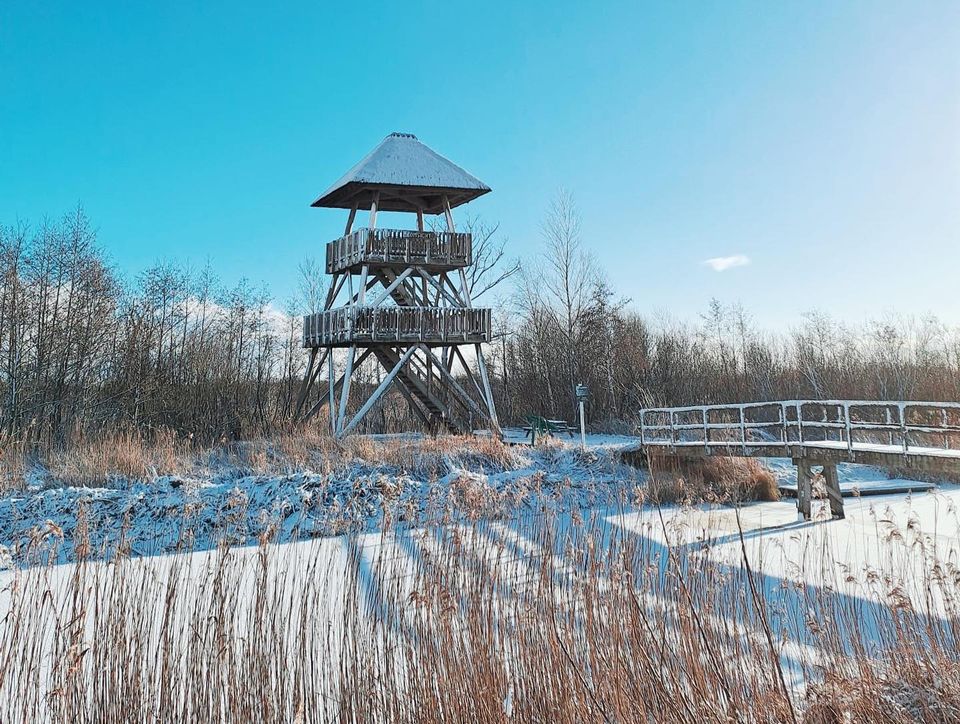 Vanaf de uitkijktoren Romsicht in Nationaal Park De Alde Feanen heb je een prachtig uitzicht over het besneeuwde landschap van rietvelden, water en moeras. Het witte winterdecor strekt zich eindeloos uit, waardoor je mooie panoramafoto’s kunt maken die echt de sfeer van De Alde Feanen vangen.